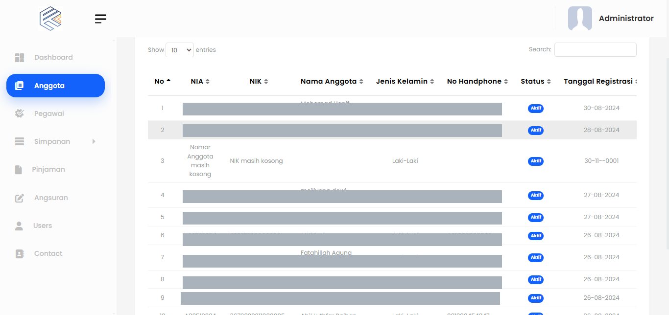 Pada halaman anggota terdapat seluruh data anggota yang terdaftar di aplikasi koperasi.