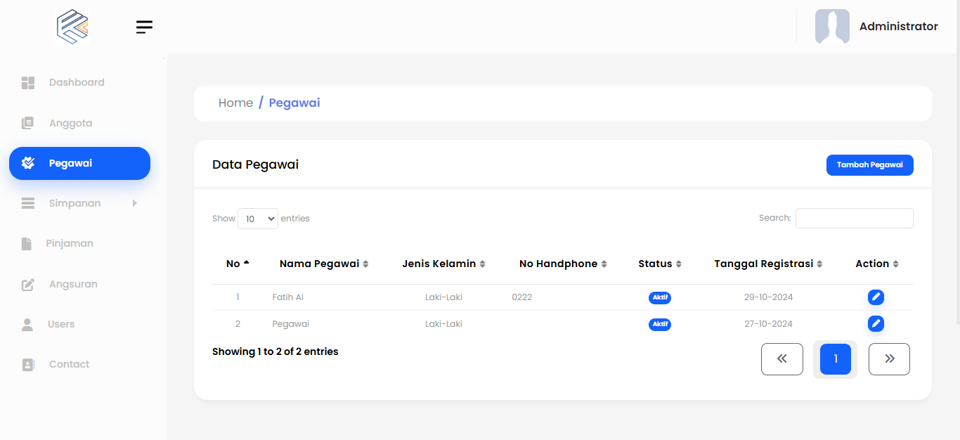 Pada halaman anggota terdapat seluruh data pegawai yang masih aktif di perusahaan dan termuat di dalam aplikasi koperasi.