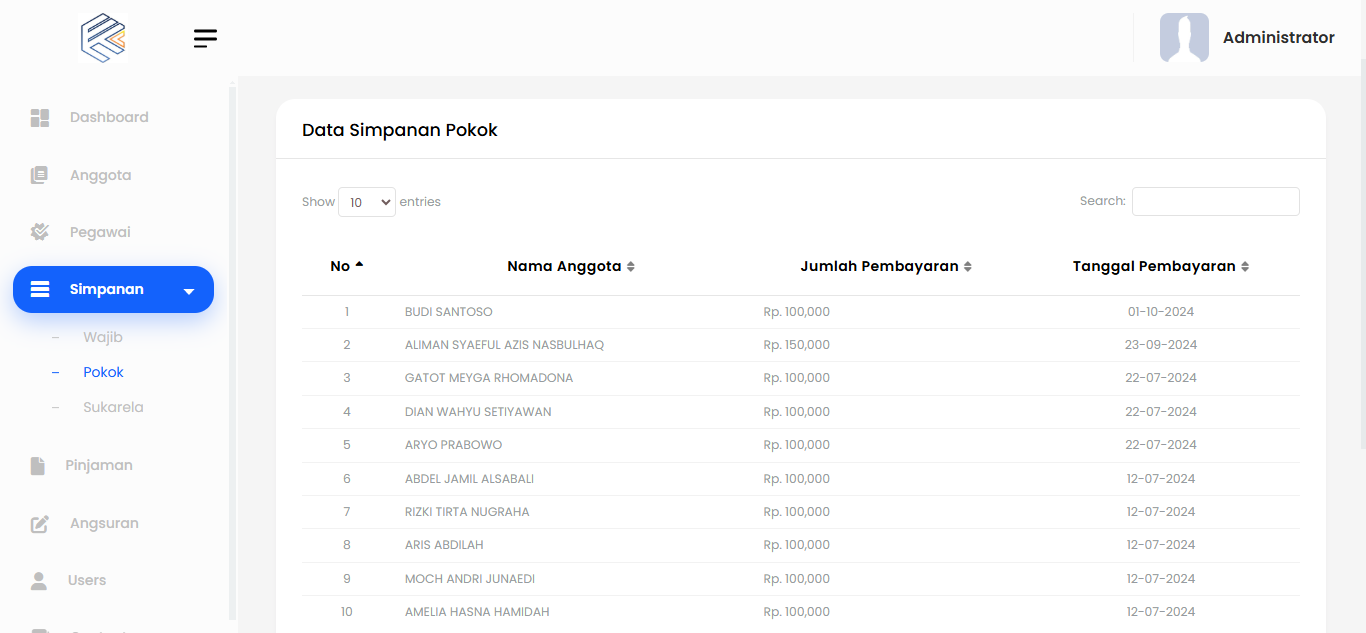 Halaman Simpanan Pokok digunakan untuk menampilkan data simpanan pokok yang telah masuk ke dalam aplikasi.
