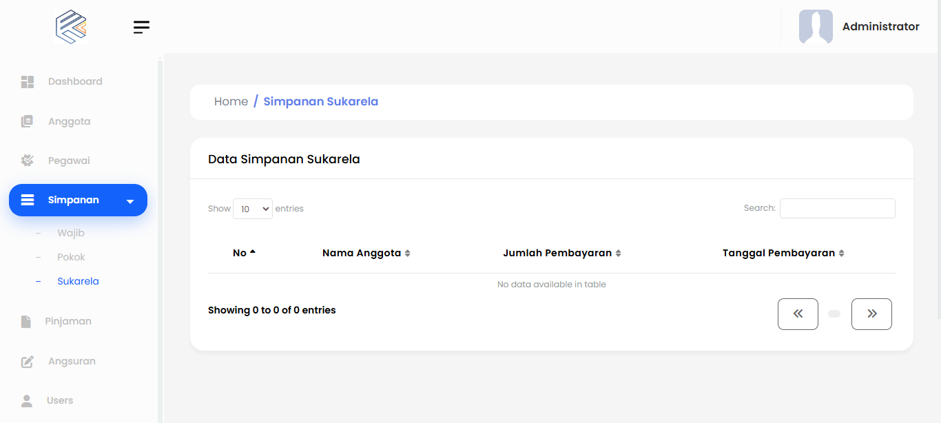 Halaman Simpanan Sukarela digunakan untuk menampilkan data simpanan sukarela dari anggota yang masuk ke dalam aplikasi.