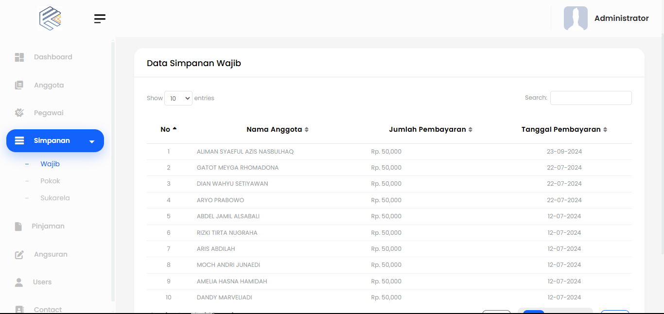 Halaman Simpanan Wajib digunakan untuk menampilkan seluruh data simpanan wajib yang telah diinputkan oleh anggota