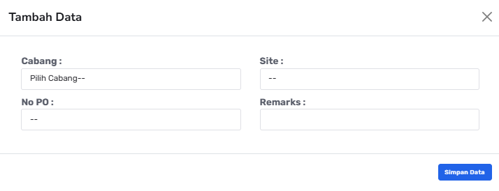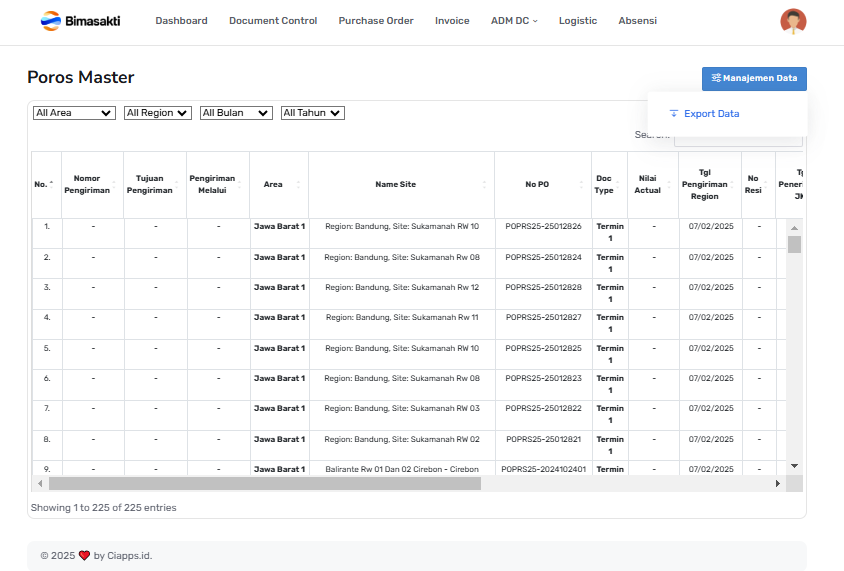 Berikut ini adalah tampilan dari Data Poros Master yang menampilkan seluruh data dalam bentuk table berdasarkan area, site, No. PO