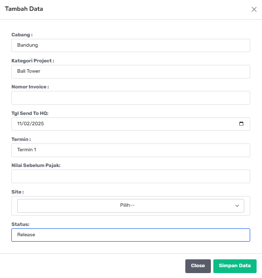 Berikut ini adalah tampilan dari data Invoice yang menampilkan seluruh data dalam bentuk table berdasarkan nama project, no. Invoice, region