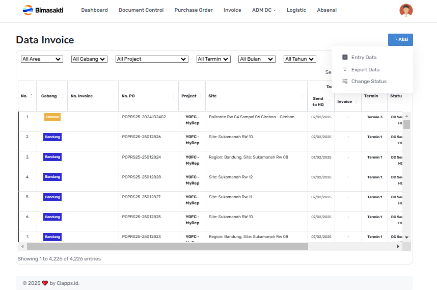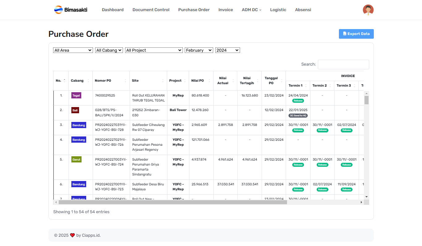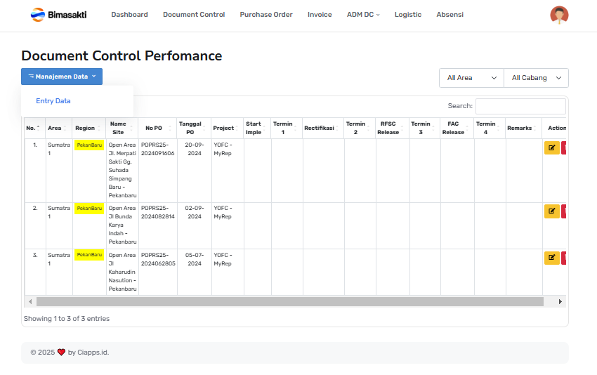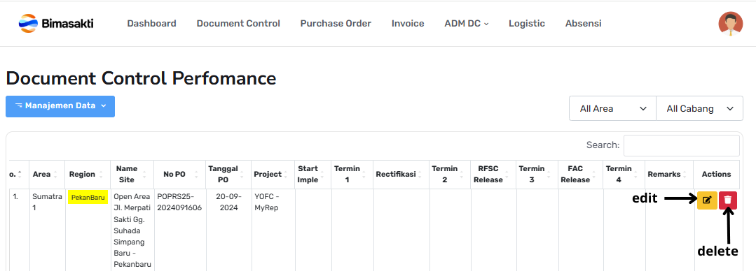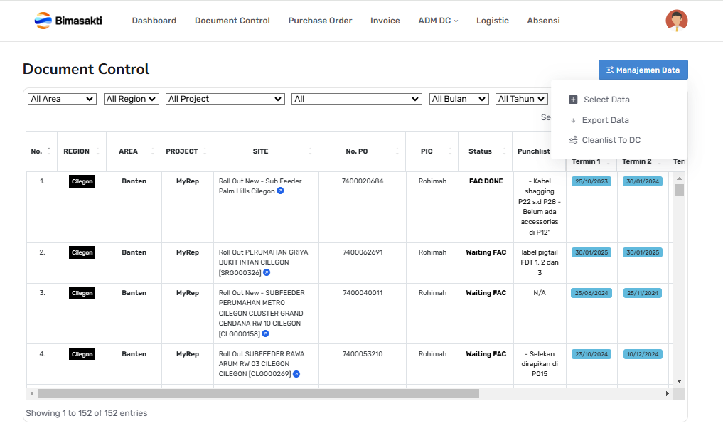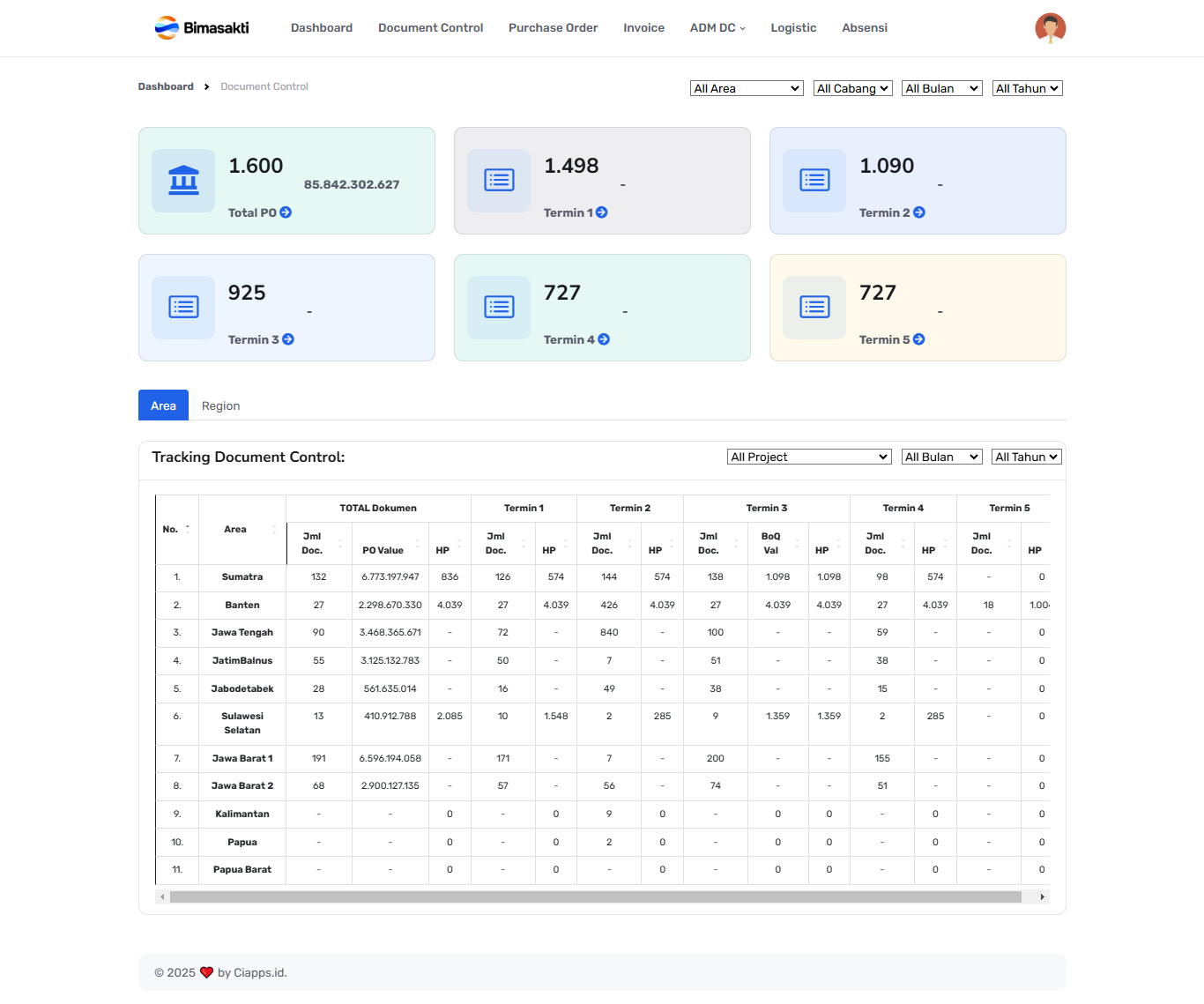 Kemudian dilengkapi dengan filter yang bisa menyaring data sesuai area, region, nama project, status, bulan, dan tahun. Lalu terdapat juga menu navbar yang terdiri dari Document Control, Purchase Order, Invoice, ADM DC, Logistik dan Absensi.