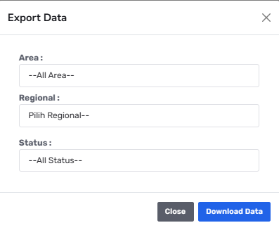 1. Klik Export Data kemudian pilih area, regional ,dan status.