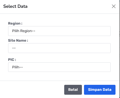 1. Klik Select Data kemudian pilih region, site name ,dan PIC.