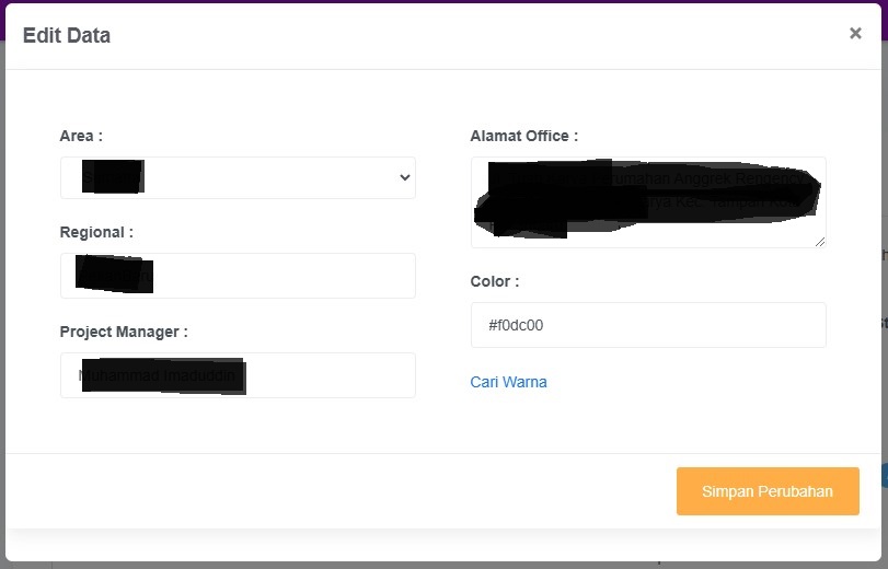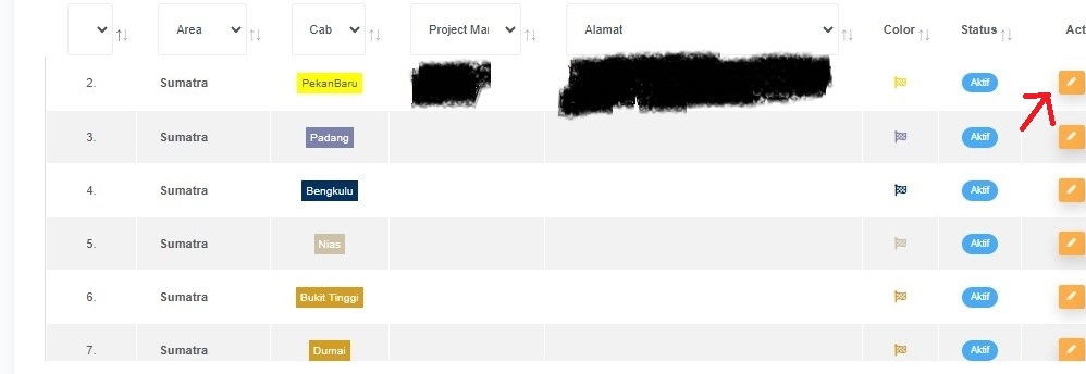 - 4. memperbaharui data cabang meliputi kolom area, regional, project manager, alamat office dan color yang telah disediakan.