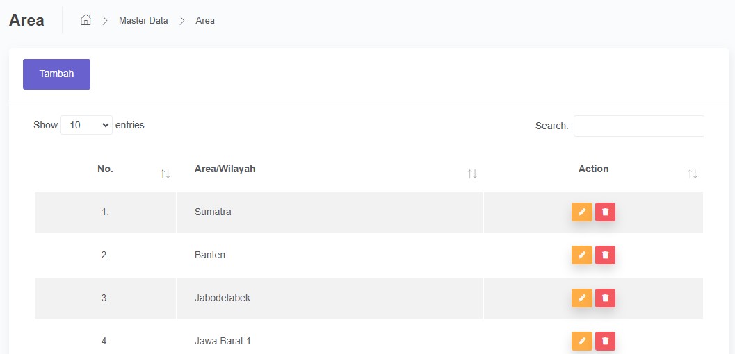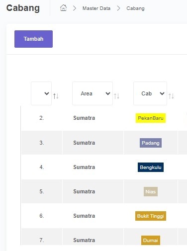 Fitur berisi kumpulan data yang mendokumentasikan informasi terperinci dan terstruktur tentang cabang atau wilayah. data ini digunakan sebagai referensi utama untuk pengelolaan operasional.