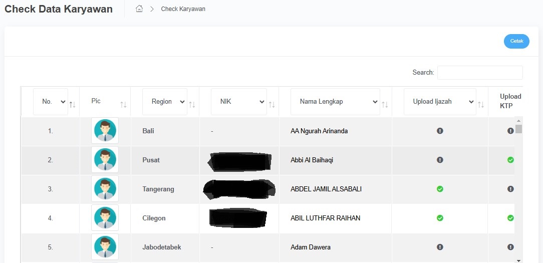 Fitur Check Karyawan memungkinkan pengguna memeriksa berbagai aspek pengelolaan karyawan, mulai dari data Ijazah, KK, Akta Lahir, Pengalaman atau Sertifikasi sudah dilengkapi atau belum dilengkapi oleh karyawan dan bisa melakukan export/cetak data ke Excel.