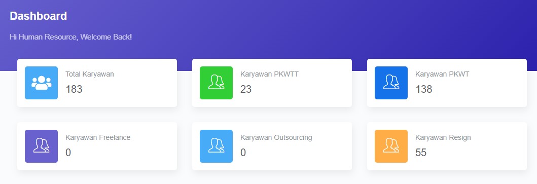 Dashboard terdiri dari 2 bagian yaitu: 1. Total Card dan 2. Tracker Absensi