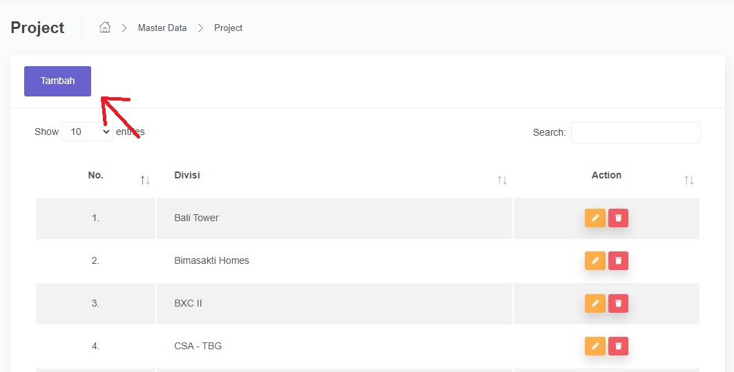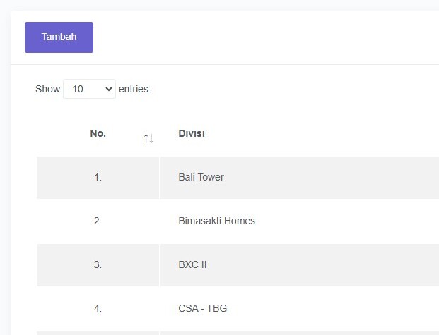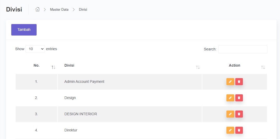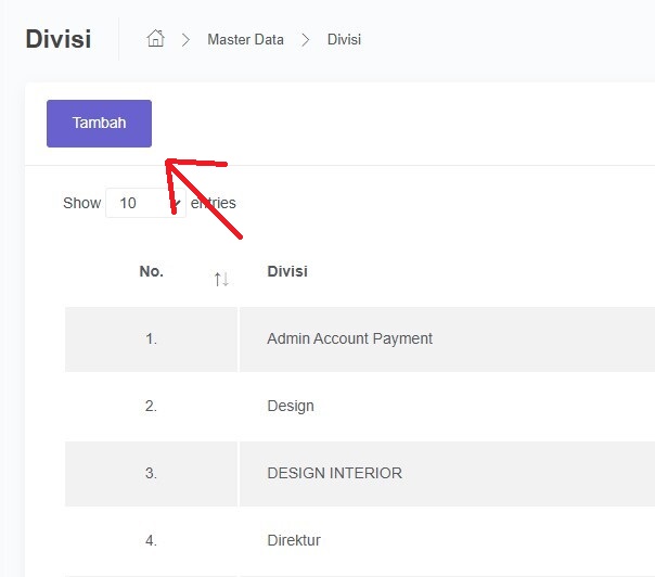 - 1. klik tombol Tambah untuk menambahkan data divisi