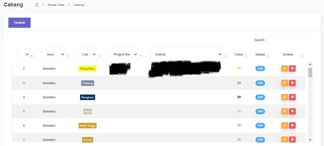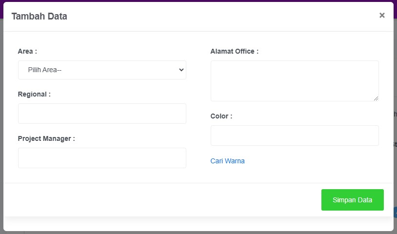 - 2. menambahkan data cabang meliputi kolom area, regional, project manager, alamat office dan color yang telah disediakan.