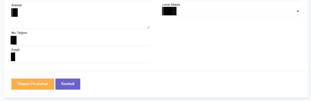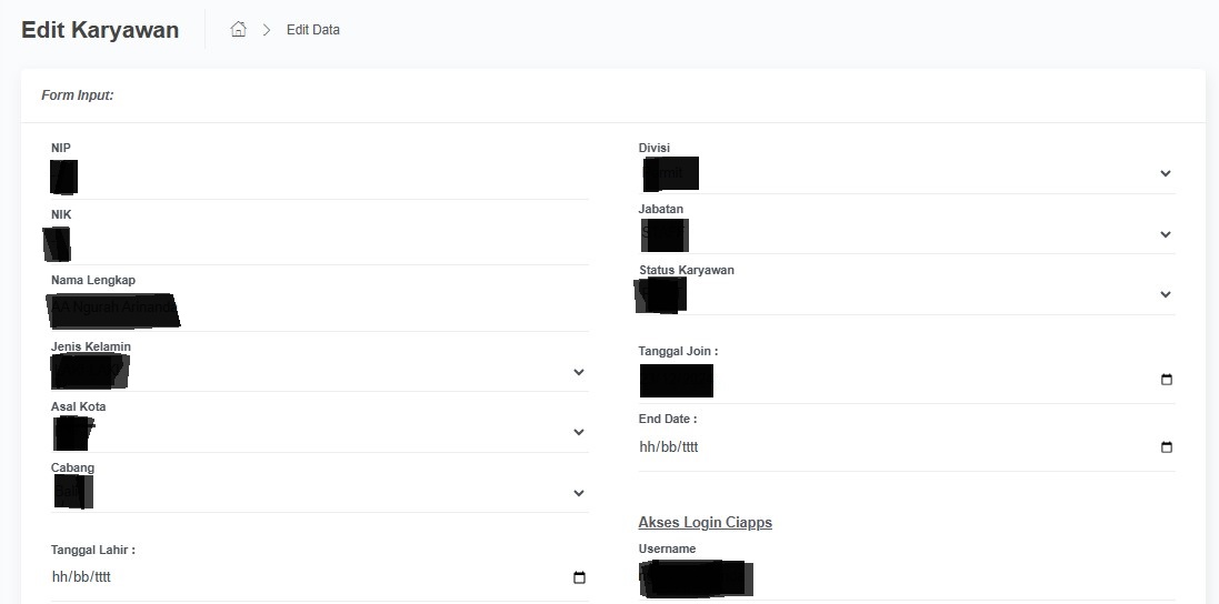 - 4. memperbaharui data karyawan meliputi nip, nik, divisi, jabatan, nama lengkap, status karyawan, jenis kelamin, tanggal join, asal kota, end date, cabang, tanggal lahir, username, password, alamat, no telpon, level akses dan email pada kolom yang telah disediakan.