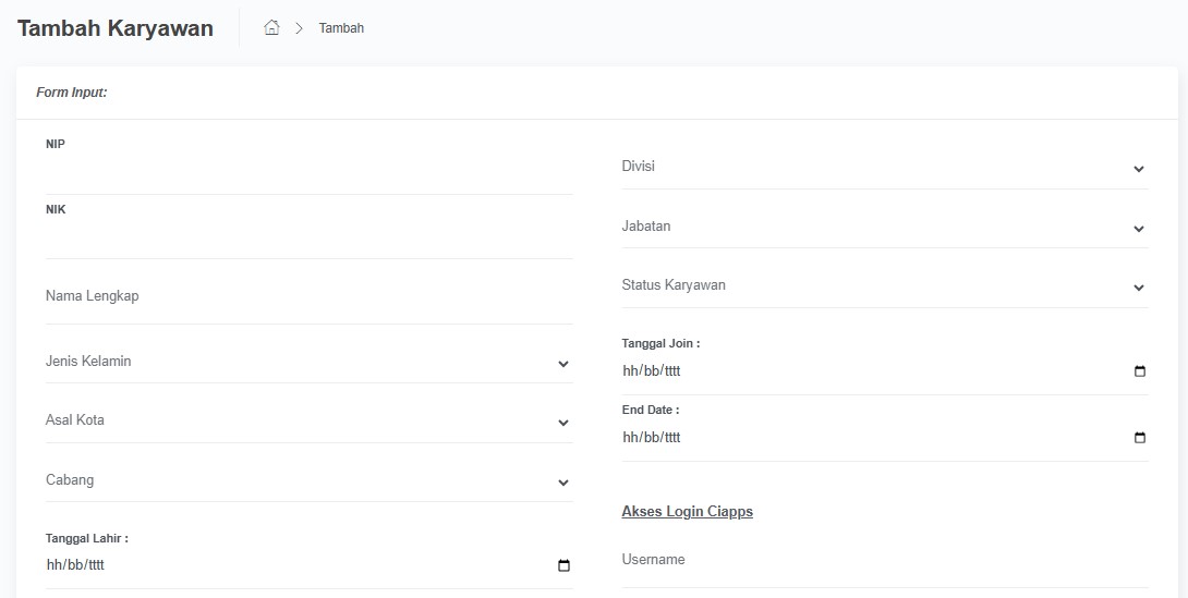 - 2. menambahkan data karyawan meliputi kolom nip, nik, divisi, jabatan, nama lengkap, status karyawan, jenis kelamin, tanggal join, asal kota, end date, cabang, tanggal lahir, username, password, alamat, no telpon, level akses dan email yang telah disediakan.