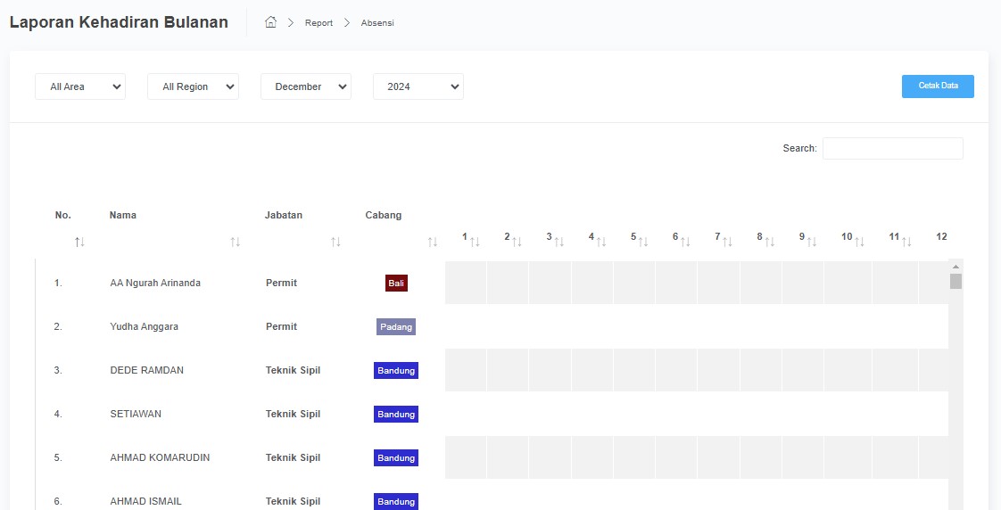 Fitur Report Absensi memungkinkan pengguna memanajemen dan menganalisis kehadiran atau absensi karyawan secara efektif. fitur ini membantu HR dalam mendapatkan laporan yang jelas mengenai kehadiran, izin, lembur, ketidakhadiran karyawan dan bisa melakukan export/cetak data ke Excel.