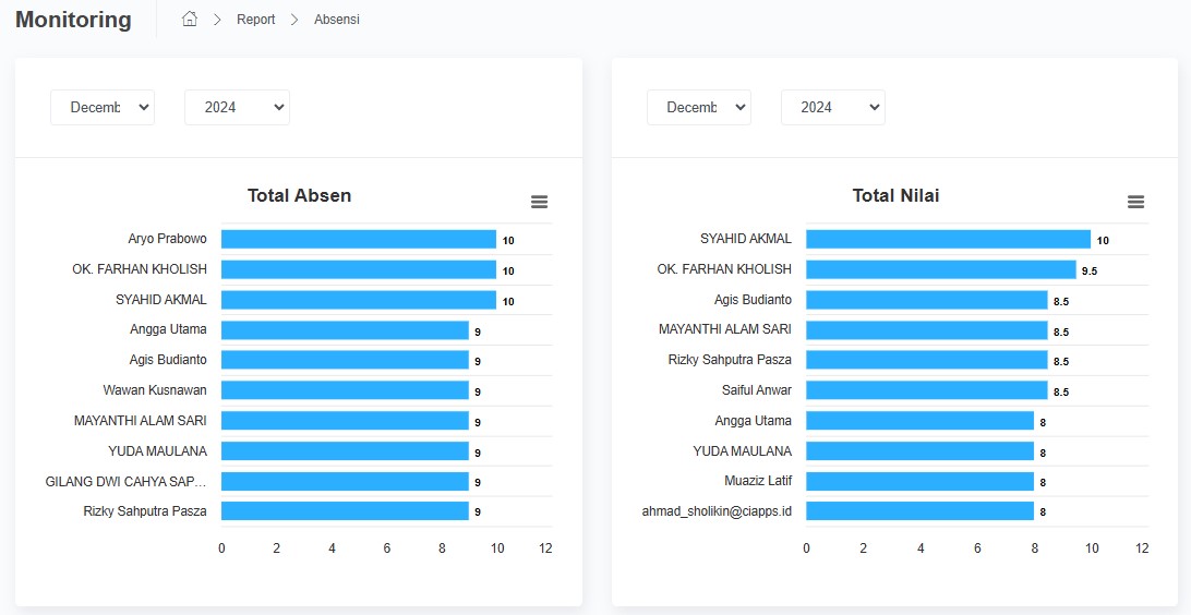 Fitur Monitoring Absensi memungkinkan pengguna memantau dan mengelola kehadiran karyawan secara efektif sesuai dengan aturan yang telah ditetapkan.fitur terdiri dari 2 bagian yaitu: 1. Chart dan 2. Data Dalam Bentuk Table dan bisa melakukan export/cetak data ke Excel.