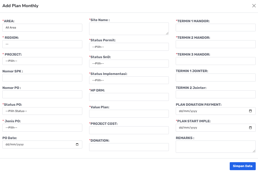 Berikut ini adalah tampilan dari data plan montnly yang menampilkan seluruh data plan project per bulannya berdasarkan status PO, region
