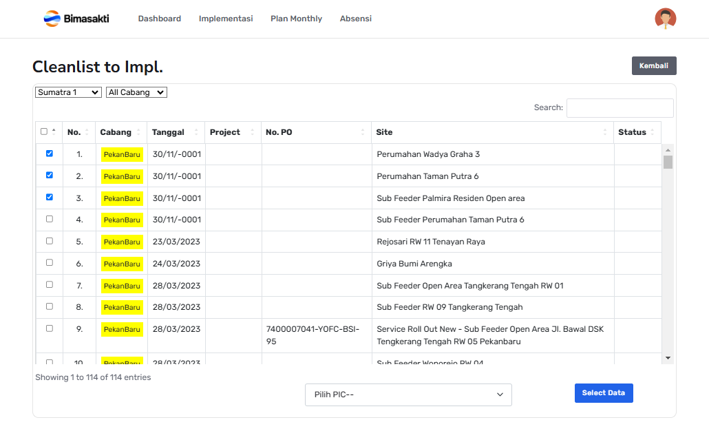 1. Klik Select Data kemudian pilih cabang, site,dan PIC.