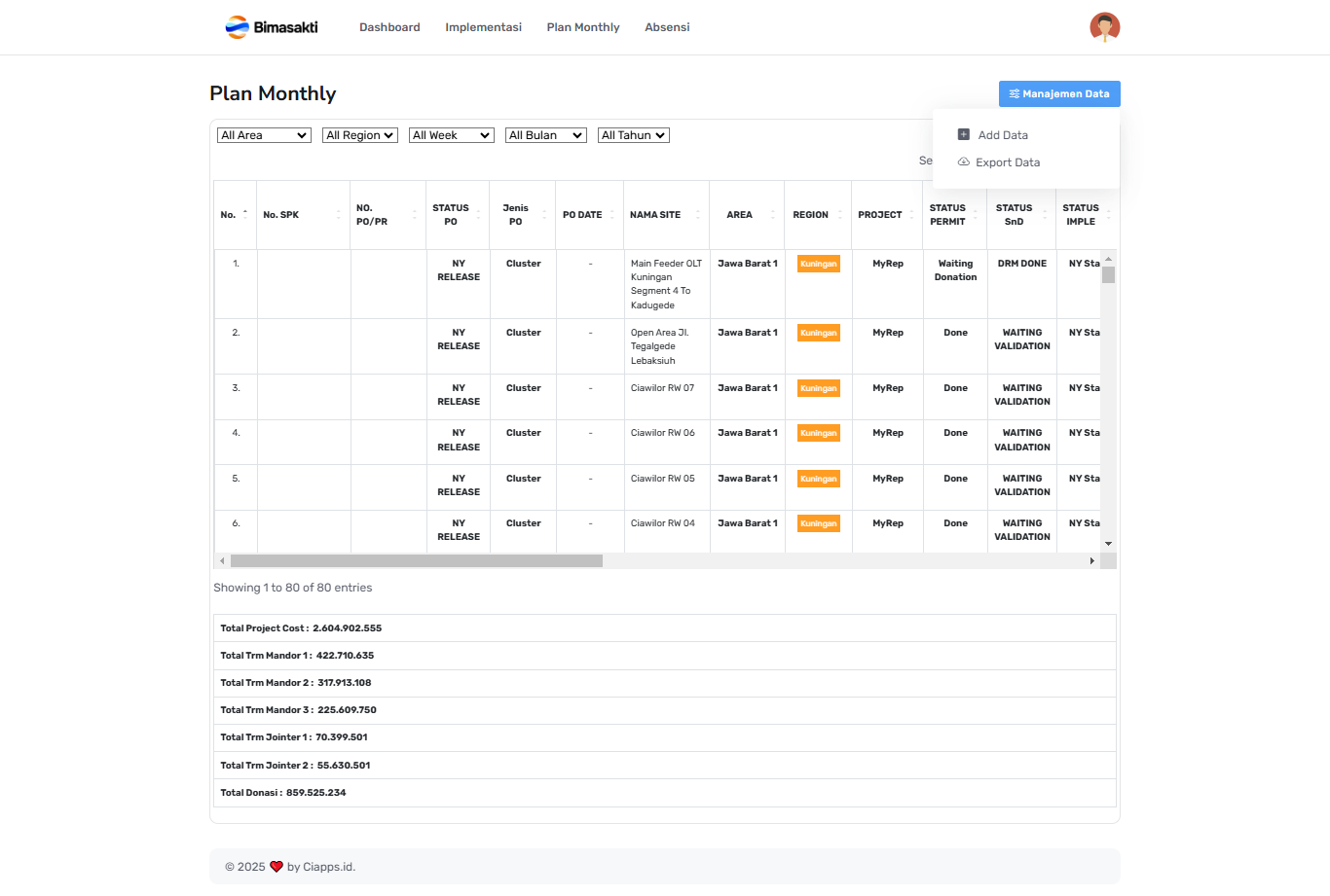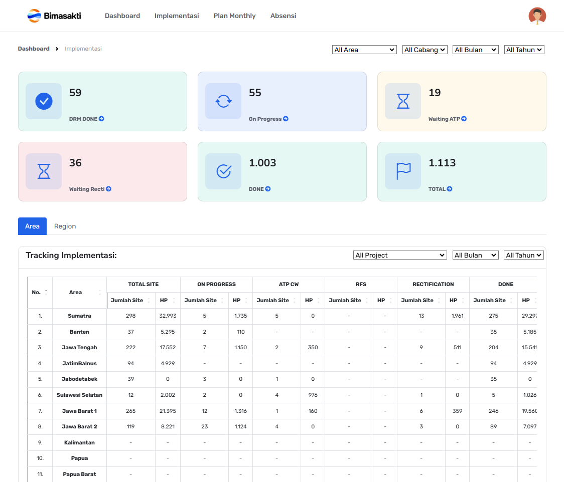 area, region, nama project, status, bulan, dan tahun. Lalu terdapat juga menu navbar yang terdiri dari Data Implementasi, Plan Monthly, dan Absensi.
