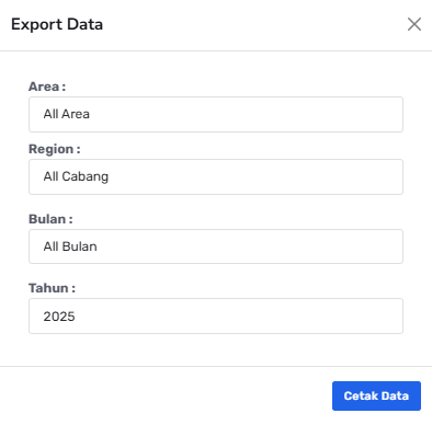 1. Klik Export Data kemudian masukkan data filter area, region, bulan, dan tahun yang ingin disimpan.