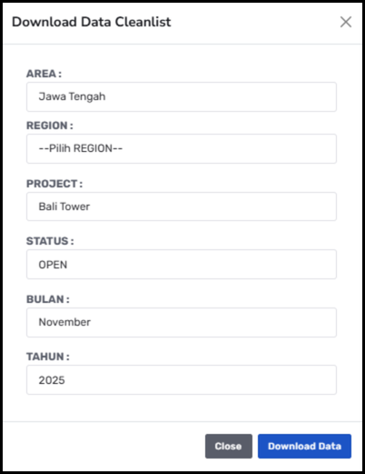 Fitur ini berfungsi untuk men-download data cleanlist yang ada sistem dengan disediakan filter area, region, nama project, status, bulan, dan tahun. Kemudian user bisa mengklik "Download Data" untuk mengunduh data cleanlist yang ada di sistem.