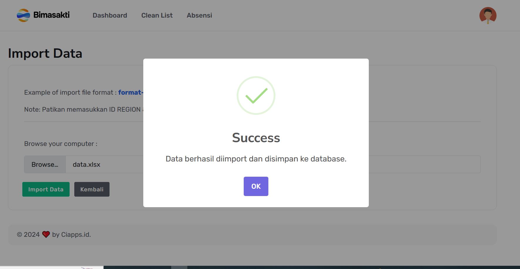 Fitur Import Data memungkinkan pengguna mengunggah file Excel (.xlsx) berisi data yang sudah disiapkan ke dalam sistem secara otomatis. Hal ini sangat membantu untuk memasukkan data secara cepat dan efisien.
