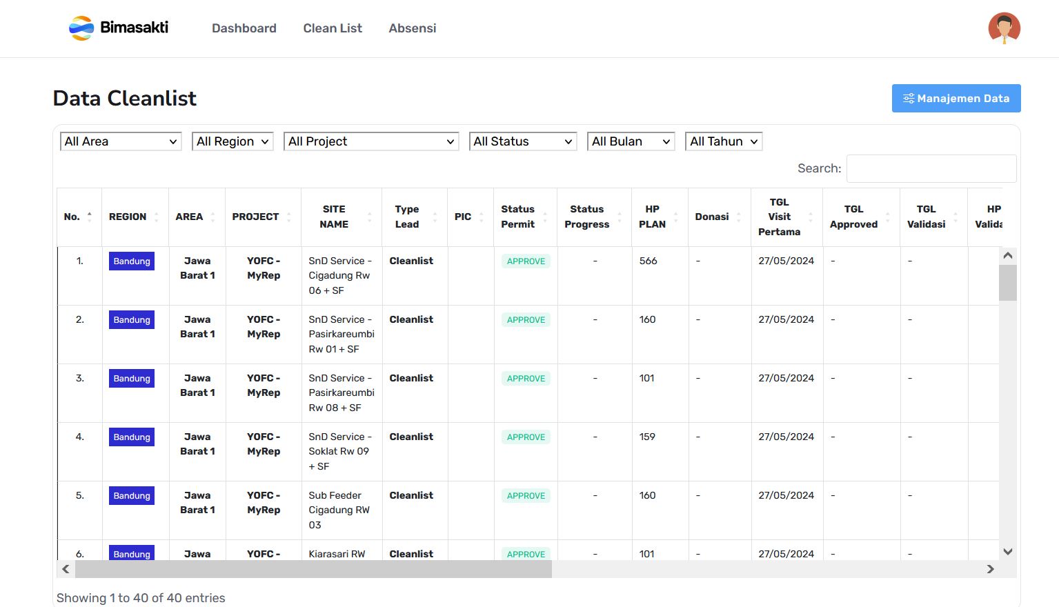 Berikut ini adalah tampilan dari data cleanlist yang menampilkan seluruh data berdasarkan region dan area. Terdapat tabel yang berisi data kemudian dilengkapi dengan filter yang bisa menyaring data sesuai area, region, nama project, status, bulan, dan tahun.